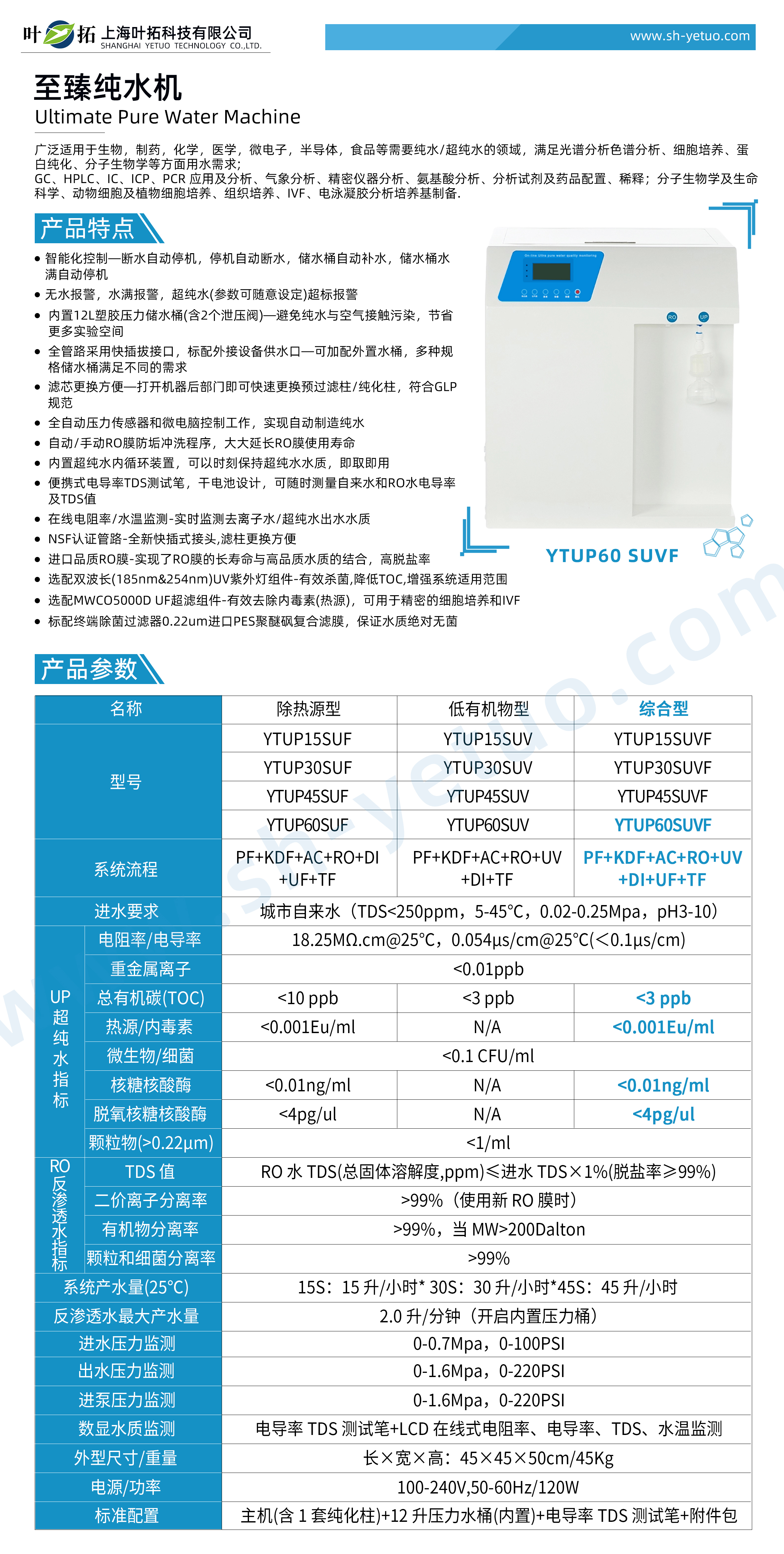 葉拓 YTUP60SUVF 超純水機(綜合型)詳細參數