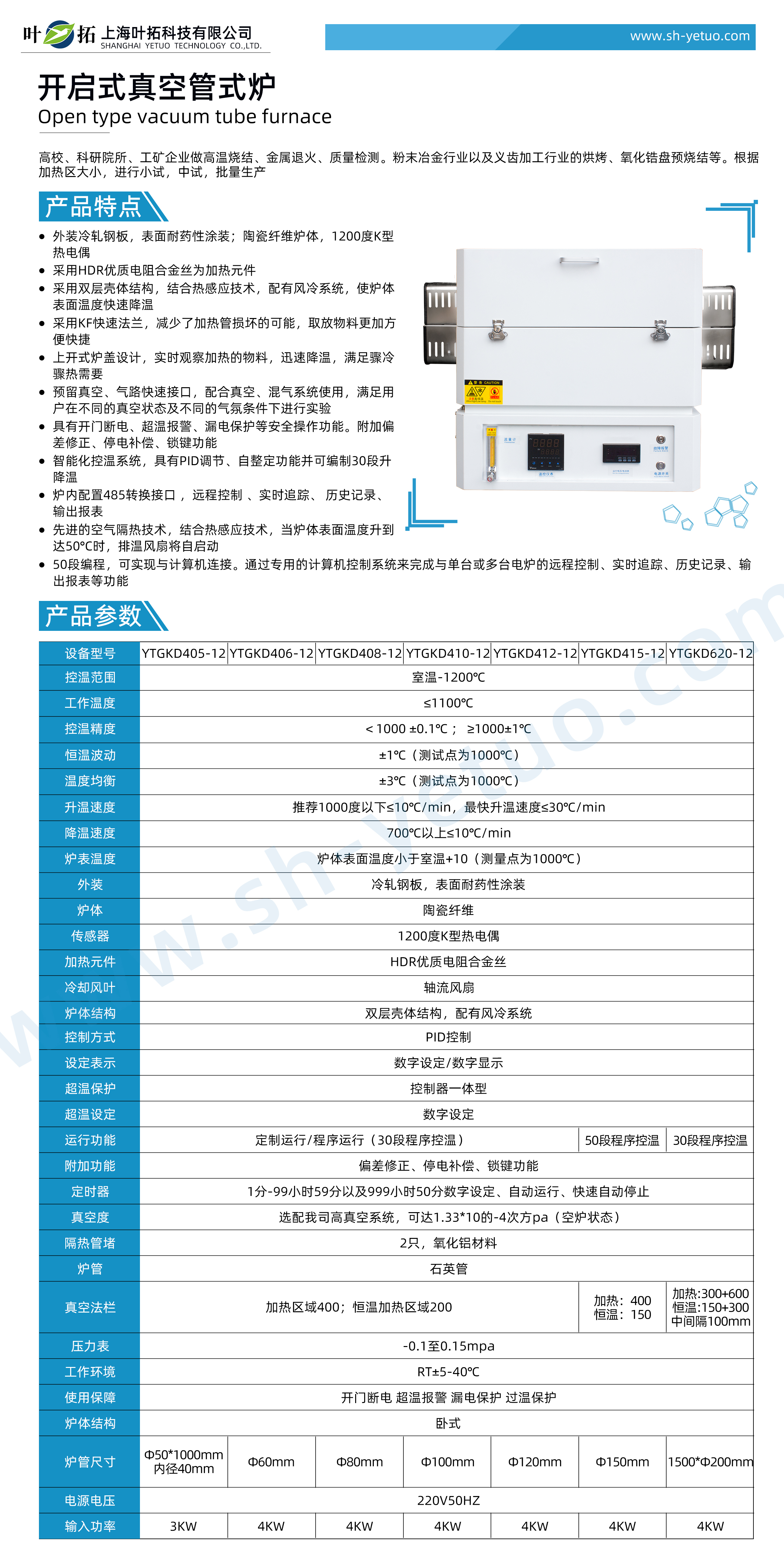 葉拓 YTGKD408-12 開啟式真空管式爐產品參數(shù)